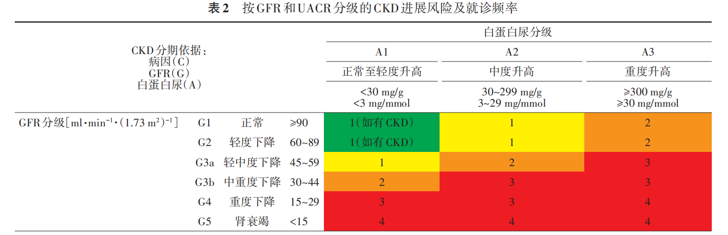注:GFR為腎小球濾過率;UACR為尿白蛋白/肌酐比值;CKD為慢性腎臟??;表格中的數(shù)字為建議每年復(fù)查的次數(shù);背景顏色代表CKD進展的風險:綠色為低風險,黃色為中風險,橙色為高風險,紅色為極高風險