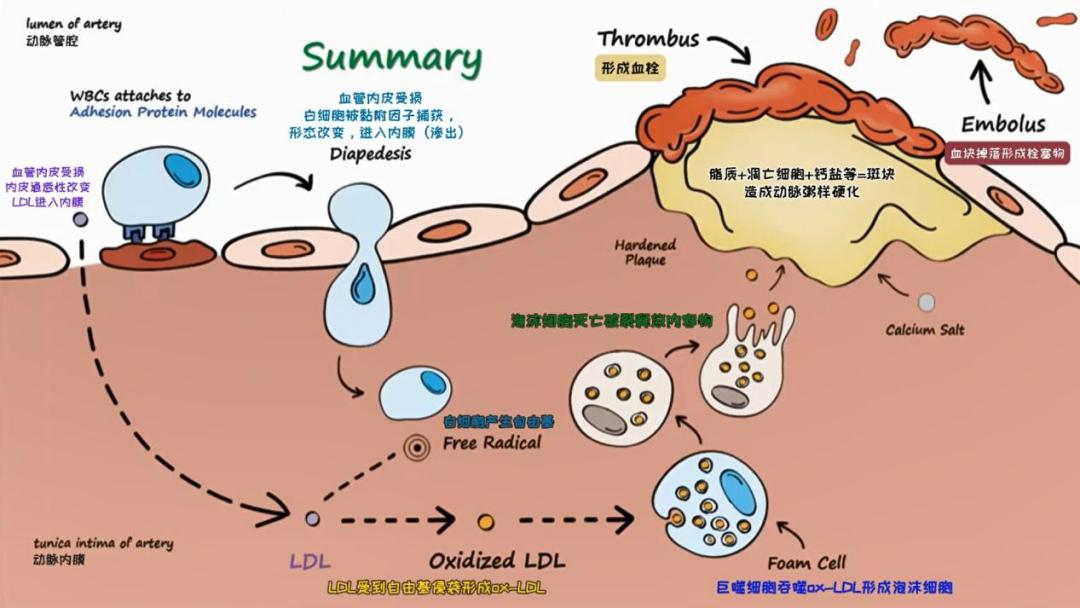 1)各種危險(xiǎn)因素致內(nèi)皮受損,LDL-C借此進(jìn)入管壁內(nèi)膜,氧化成ox-LDL加重內(nèi)皮損傷。