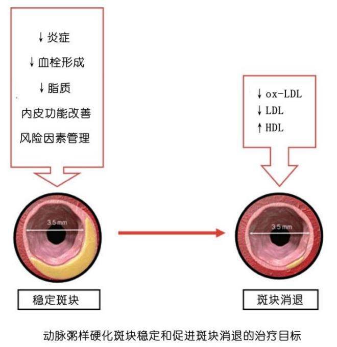 斑塊逆轉(zhuǎn)不僅在于動(dòng)脈管腔和斑塊大小的改變,更在于動(dòng)脈粥樣硬化形成的每一步中,是斑塊形態(tài)學(xué)和組成成分的共同改變,是斑塊從較容易破裂的表現(xiàn)型,向較不容易破裂的表現(xiàn)型發(fā)展的一個(gè)過程。