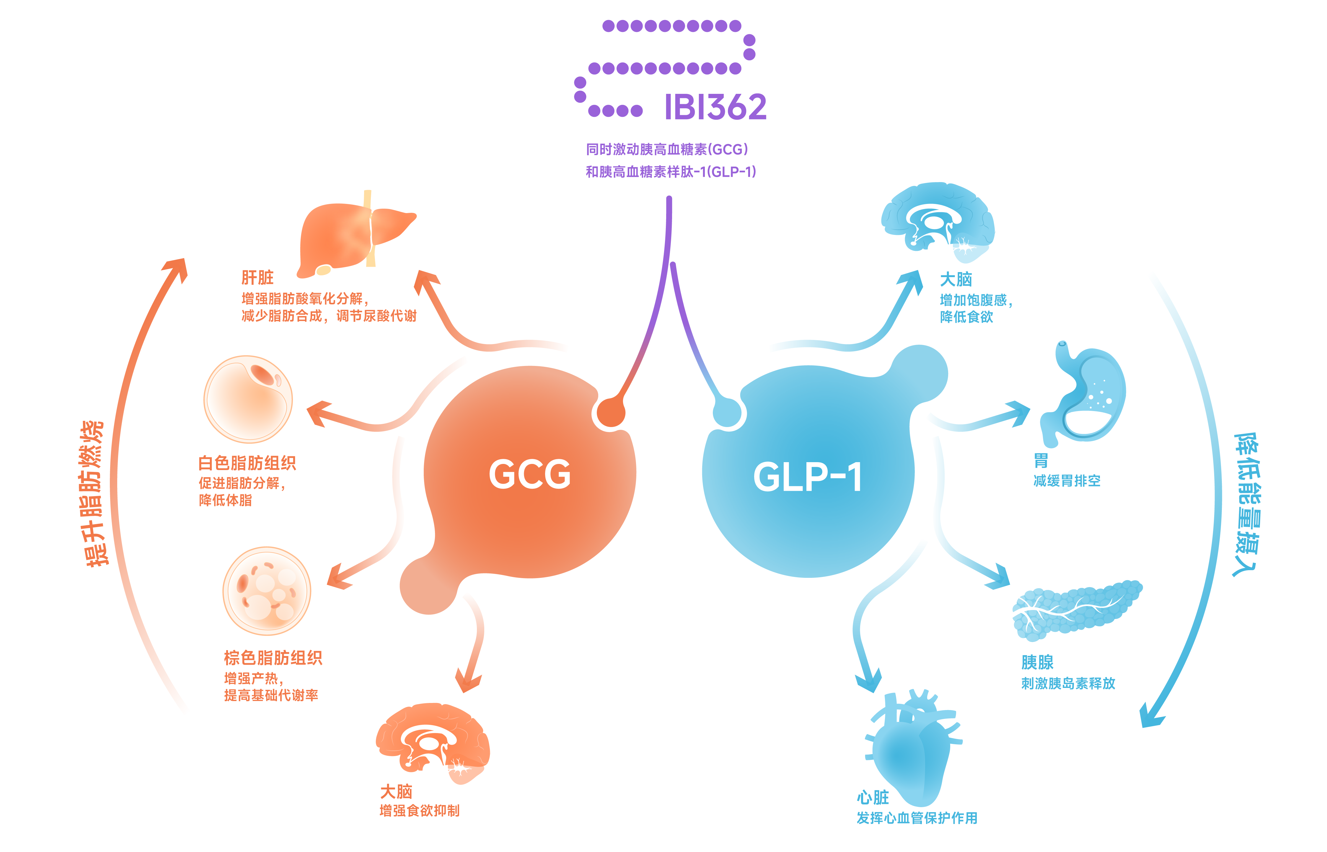 胰高血糖素(GCG)是一種由胰島α細胞分泌的激素,可通過促進糖異生和糖原分解來提高血糖濃度,除維持血糖穩(wěn)定外,胰高血糖素還參與氨基酸、脂質(zhì)代謝以及能量的攝入和消耗。因此,胰高血糖素是一種具有多種生理作用和臨床意義的綜合代謝調(diào)節(jié)激素。胰高血糖素受體激動劑通過激活胰高血糖素受體(GCGR),抑制脂肪合成、促進脂肪分解和氧化,提高能量消耗并改善肝臟脂肪代謝,肝臟炎癥和纖維化,發(fā)揮“燃脂護肝”功能,進一步增加減重效果。