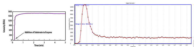 化學發(fā)光動力曲線圖(圖左 輝光型;圖右 閃光型)