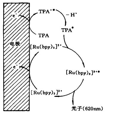 [Ru(byp)3] 2+,三丙胺(TPA)用來激發(fā)光反應。在陽極表面,兩種物質同時失去電子。在電極板上[Ru(byp)3] 2+被氧化成[Ru(byp)3] 3+,TPA也被氧化成陽離子自由基(TPA+. ),(TPA+. )自發(fā)地釋放一個質子而變成非穩(wěn)定分子(TPA.),將一個電子遞給[Ru(byp)3] 3+,形成激發(fā)態(tài)的[Ru(byp)3] 2+.。[Ru(byp)3] 2+.在衰減的同時發(fā)射一個波長為620nm的光子,重新回到基態(tài)[Ru(byp)3] 2+。這一過程在電極表面反復進行,產生高效、穩(wěn)定的連續(xù)發(fā)光,并不斷增強。
